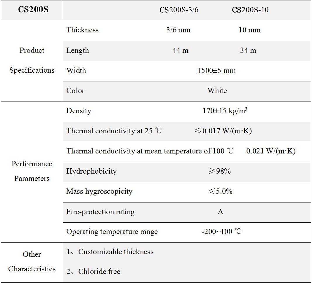 The CS200S series offers products with ultra-low thermal conductivity for cold insulation. The recommended operating temperature range is -200 ℃~100 ℃. The series is mainly used for cold preservation in the recommended fields such as refrigerators,cold storages, LNG storage and transportation.